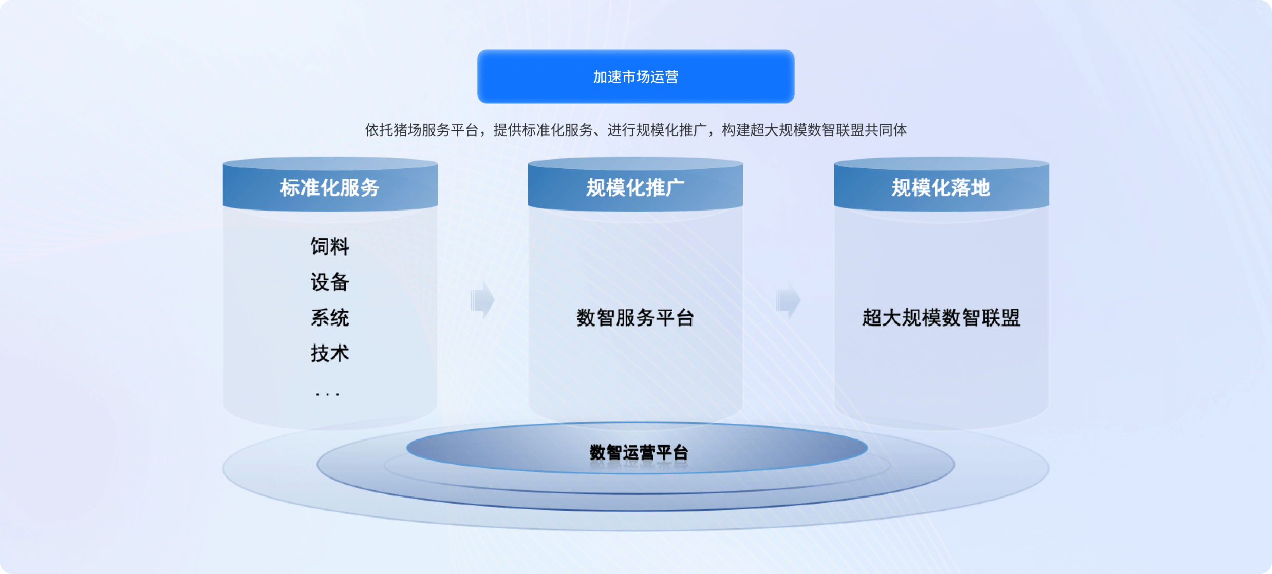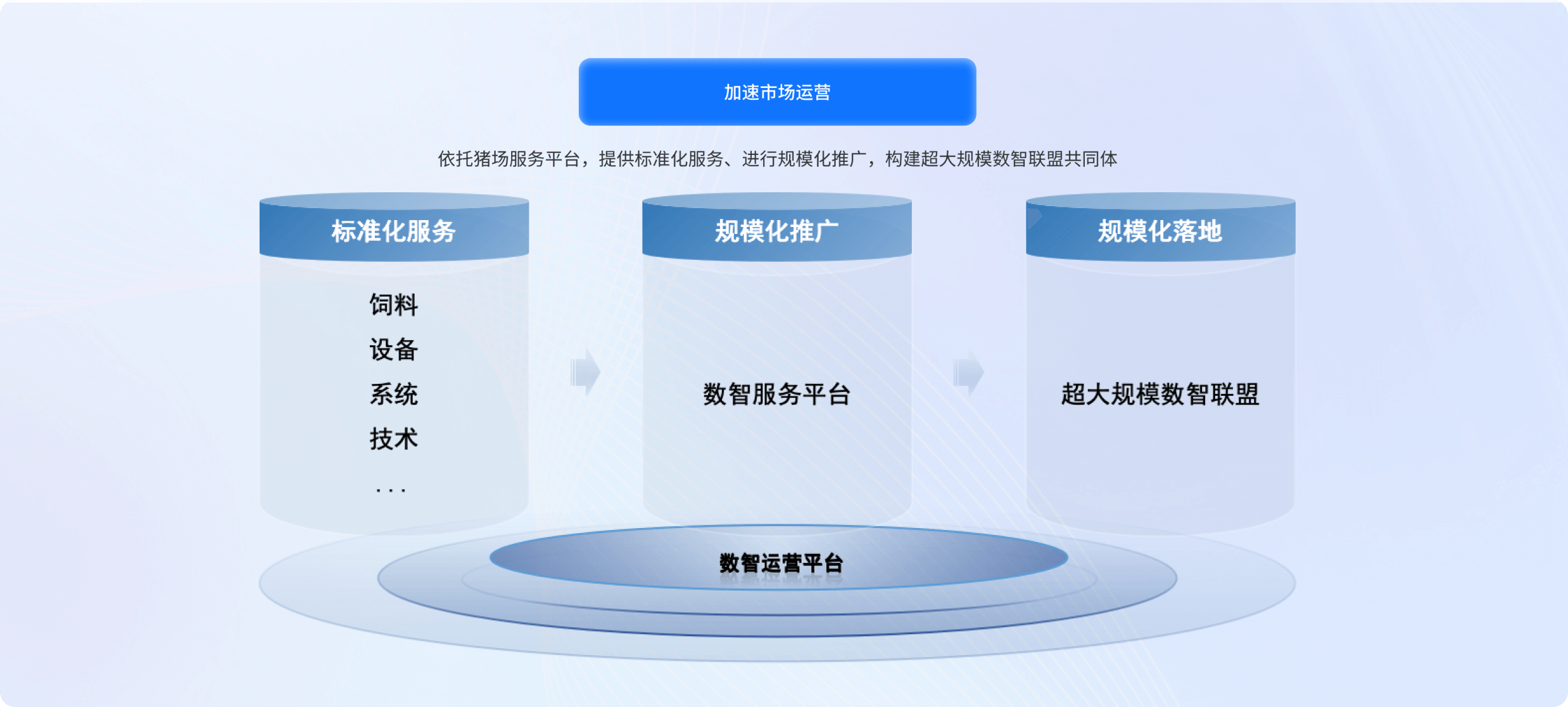 面向饲料、动保、金融等服务机构构建 "产业联盟 + 数字底座 + 场景应用" 三位一体服务体系。