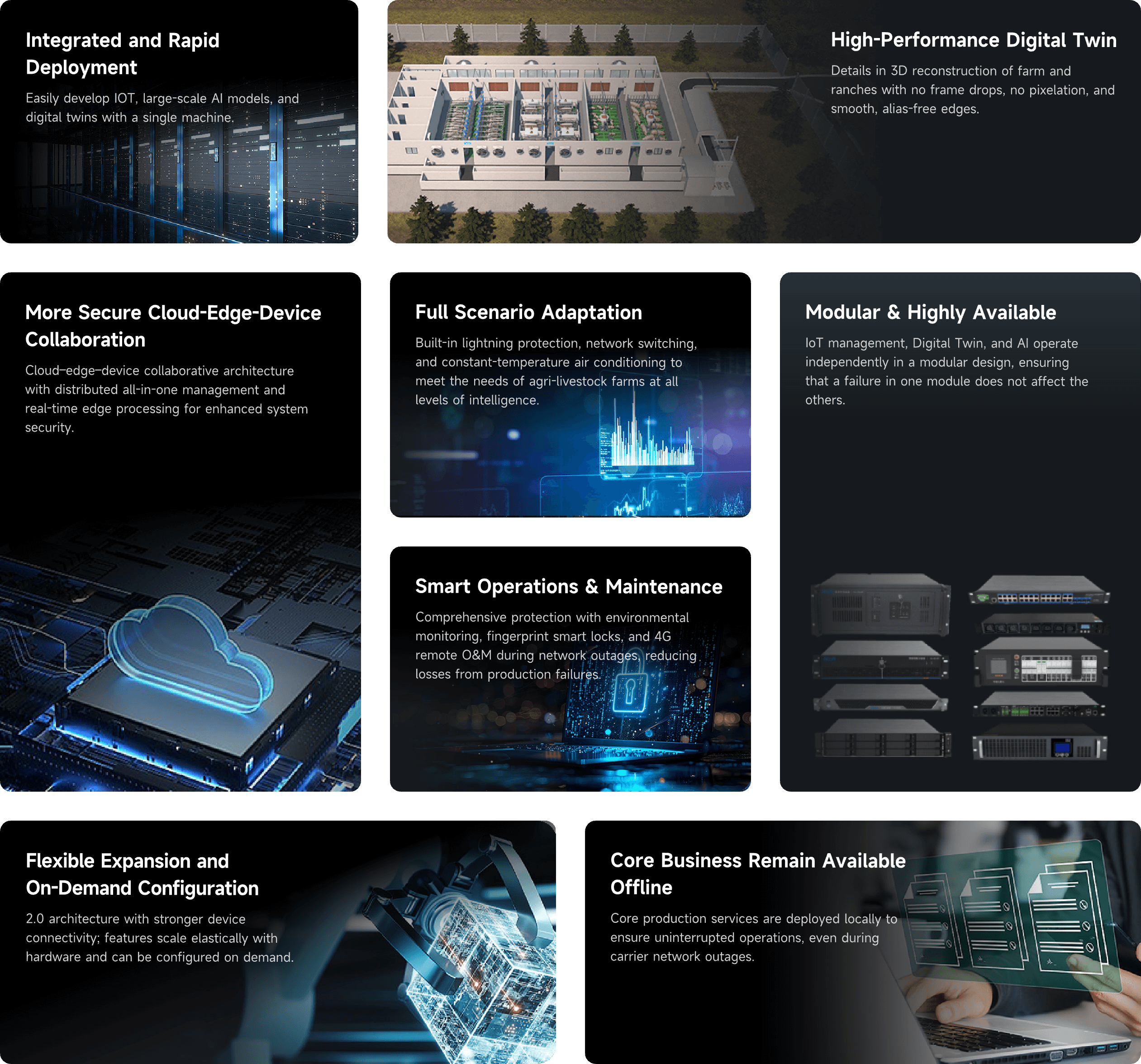 For group agri-livestock enterprises operating under a “company + farmer” model, where farmers often have only basic infrastructure, the SuperBrain All-in-One enables ultra-lightweight, rapid deployment without a temperature-controlled equipment room, while the smart O&M system makes platform-level maintenance easy.
