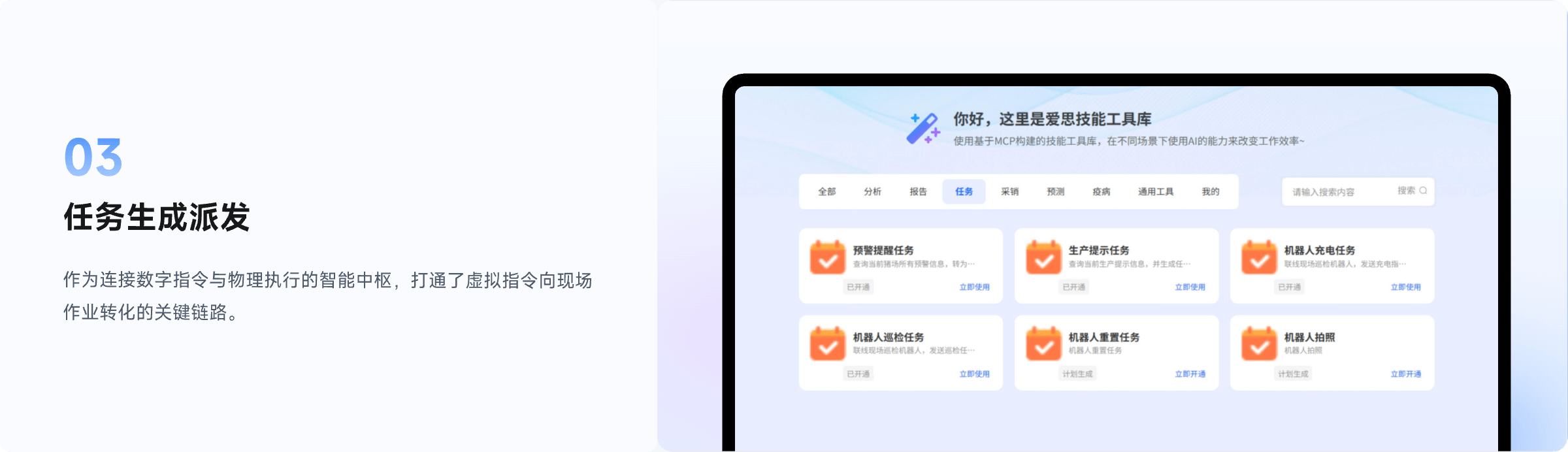 技术渗透至硬件执行层,完成从数字指令到实体动作的完整转化,如指挥巡检机器人充电等实地任务。