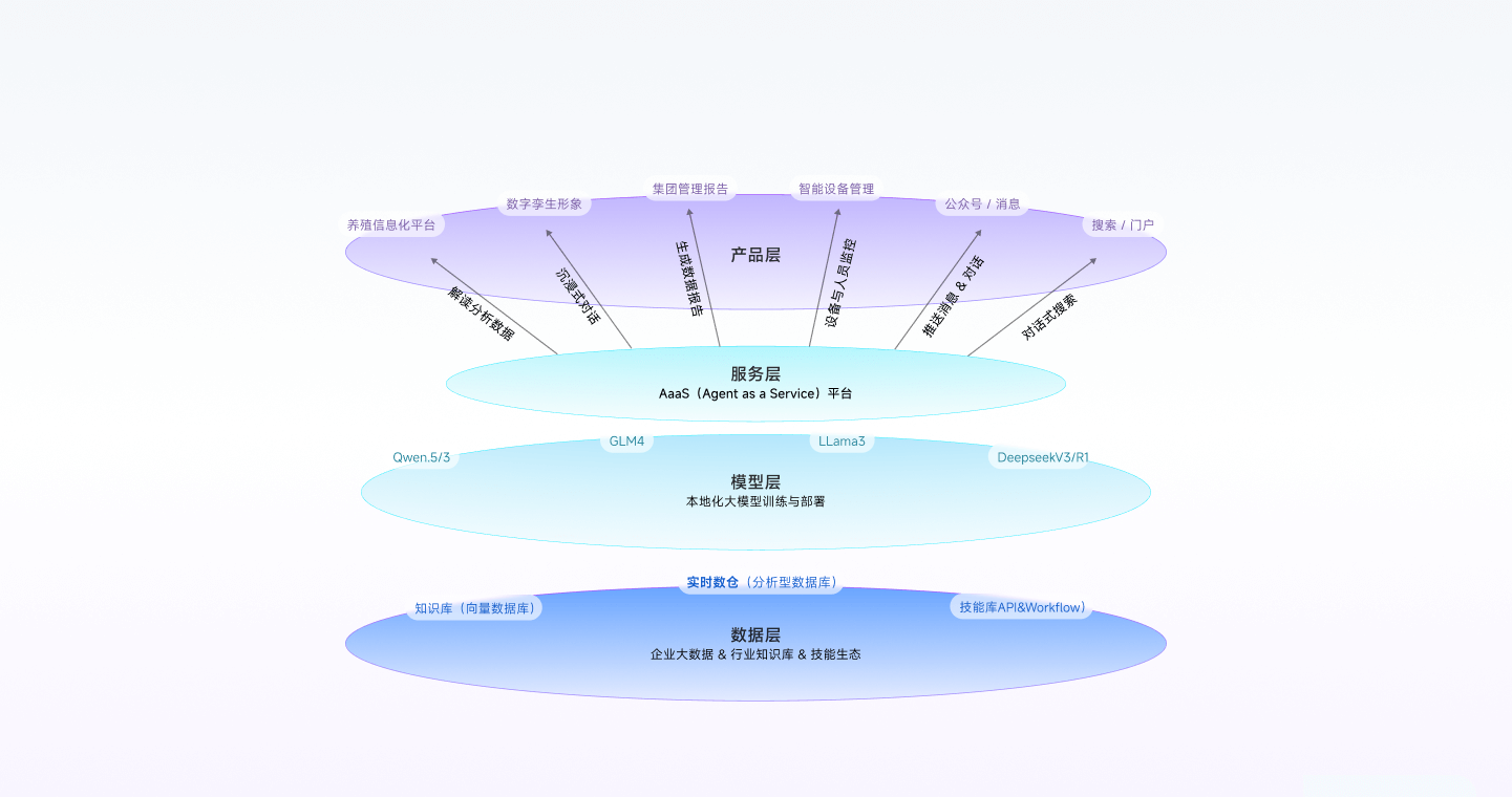 垂直专家模型,专为农业训练,精准适配农业场景和需求十年农牧大数据 + 农牧专业知识库 + 上千项核心技能多智能体架构,自动路由 + 专业化分工 + 分布式执行 + 多流程编排多模型协同,DeepSeek + 通义千问 + GLM,构建混合专家矩阵